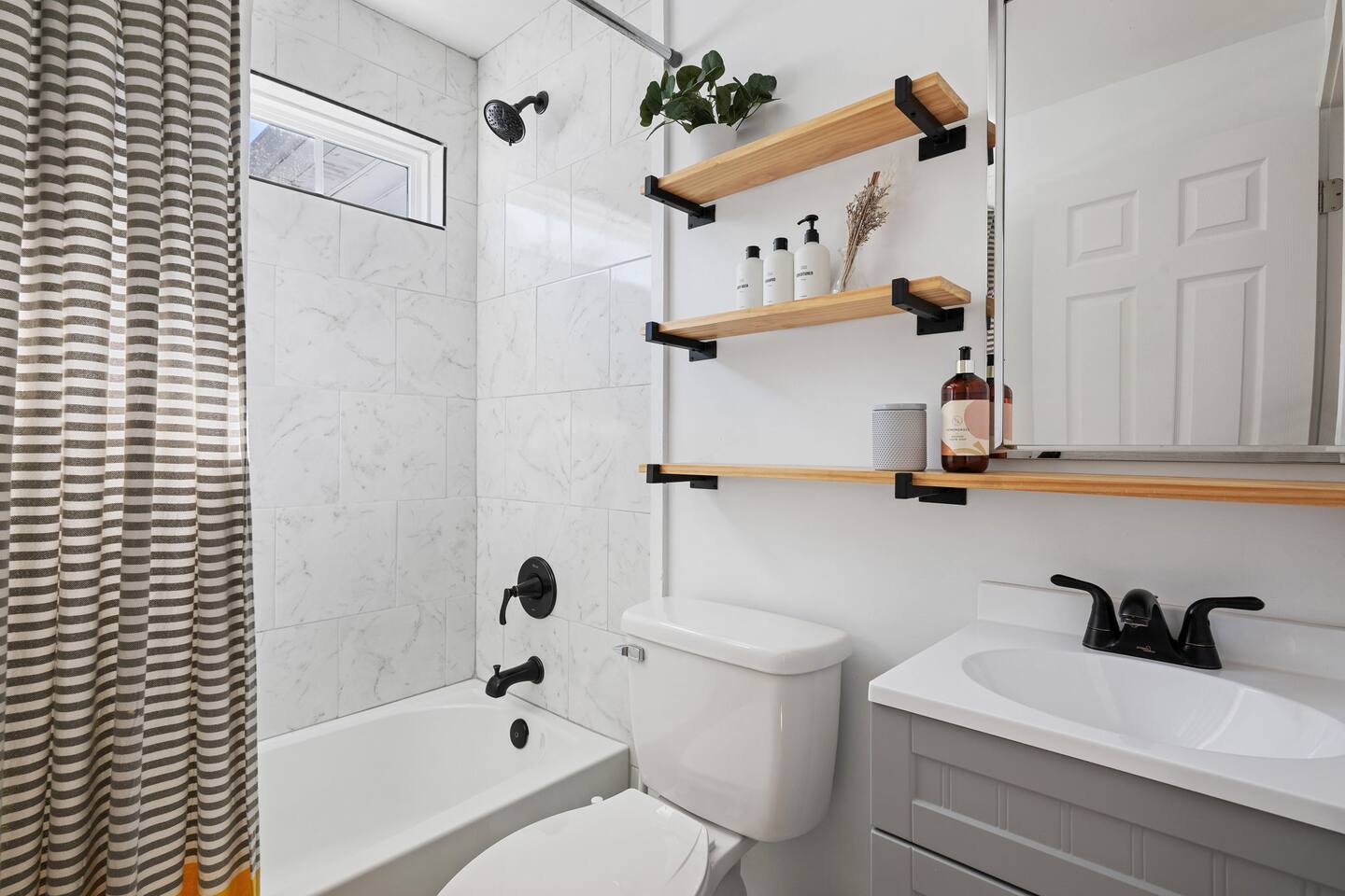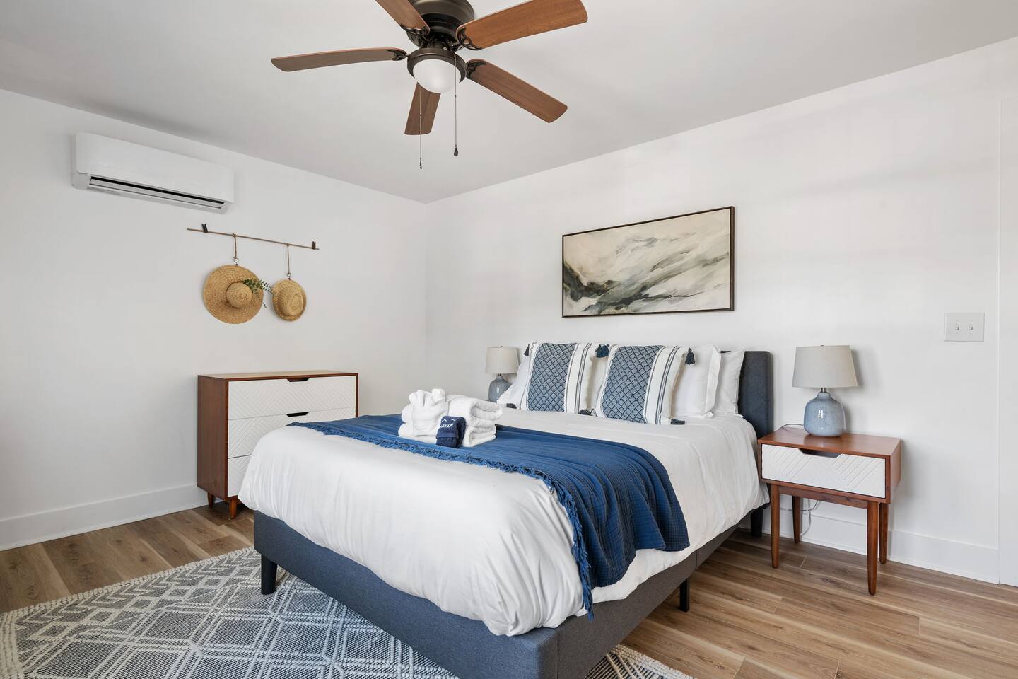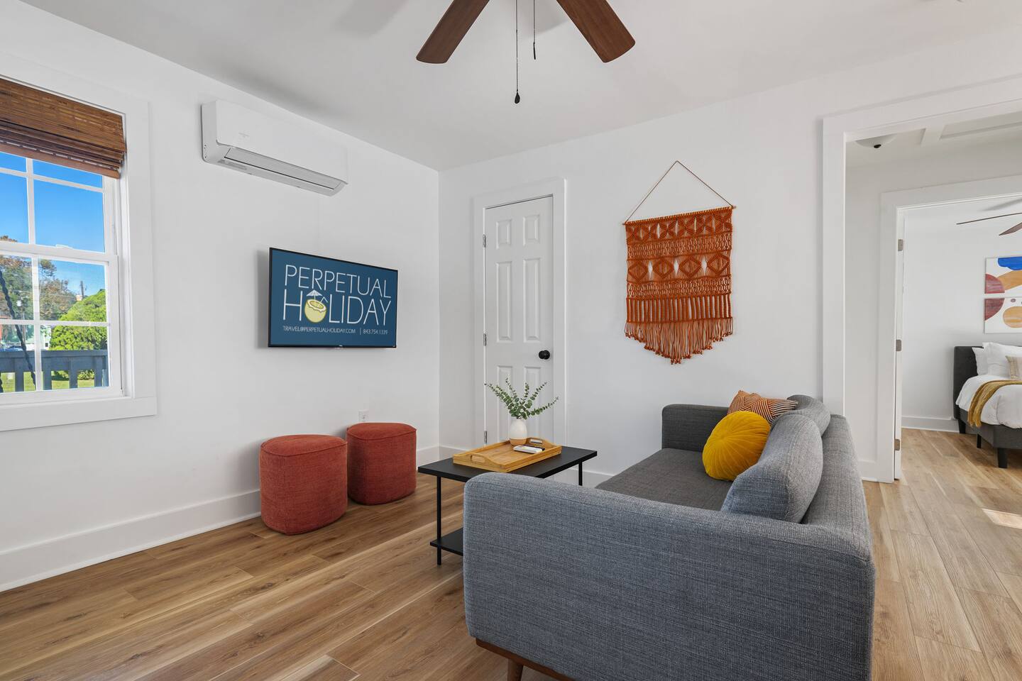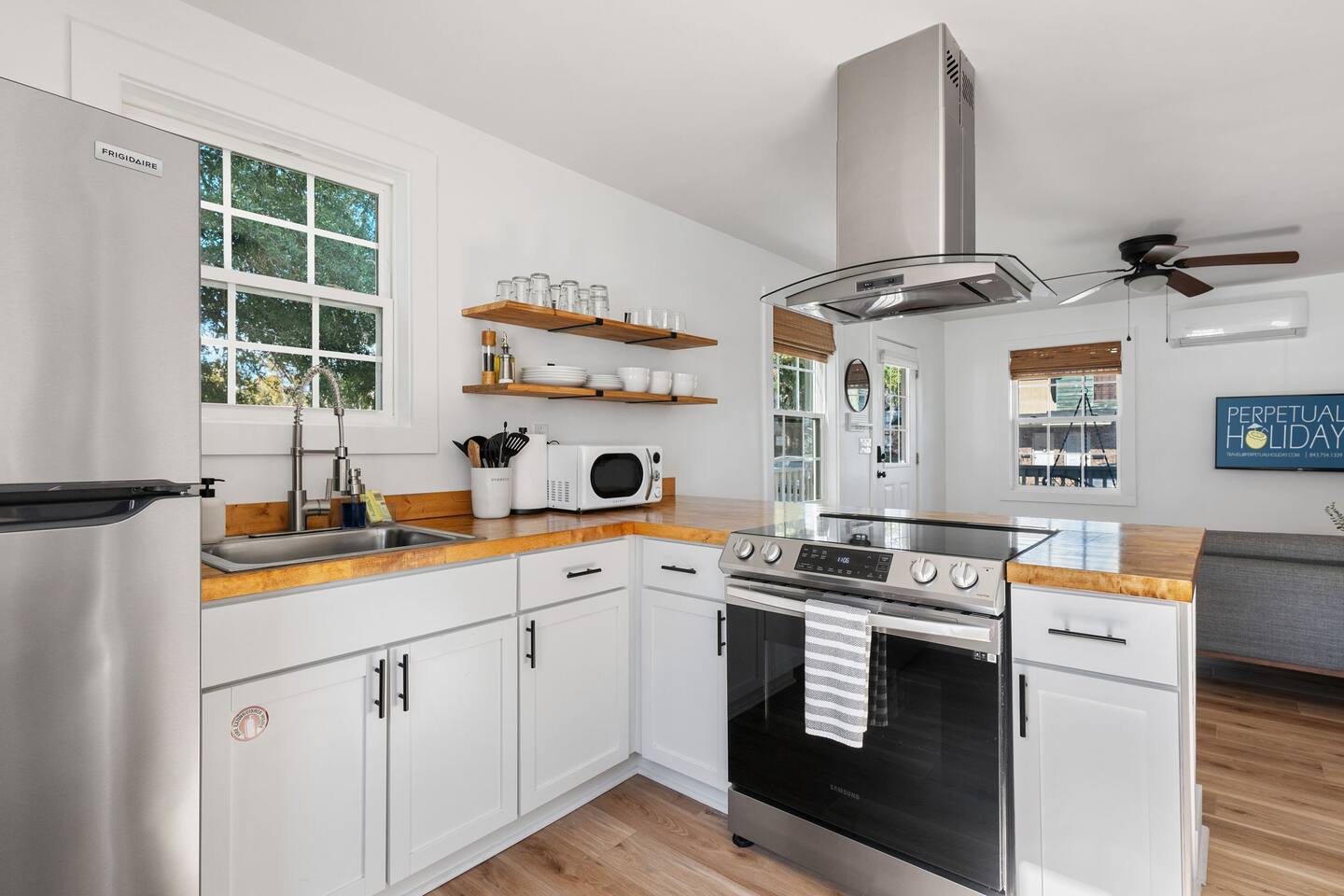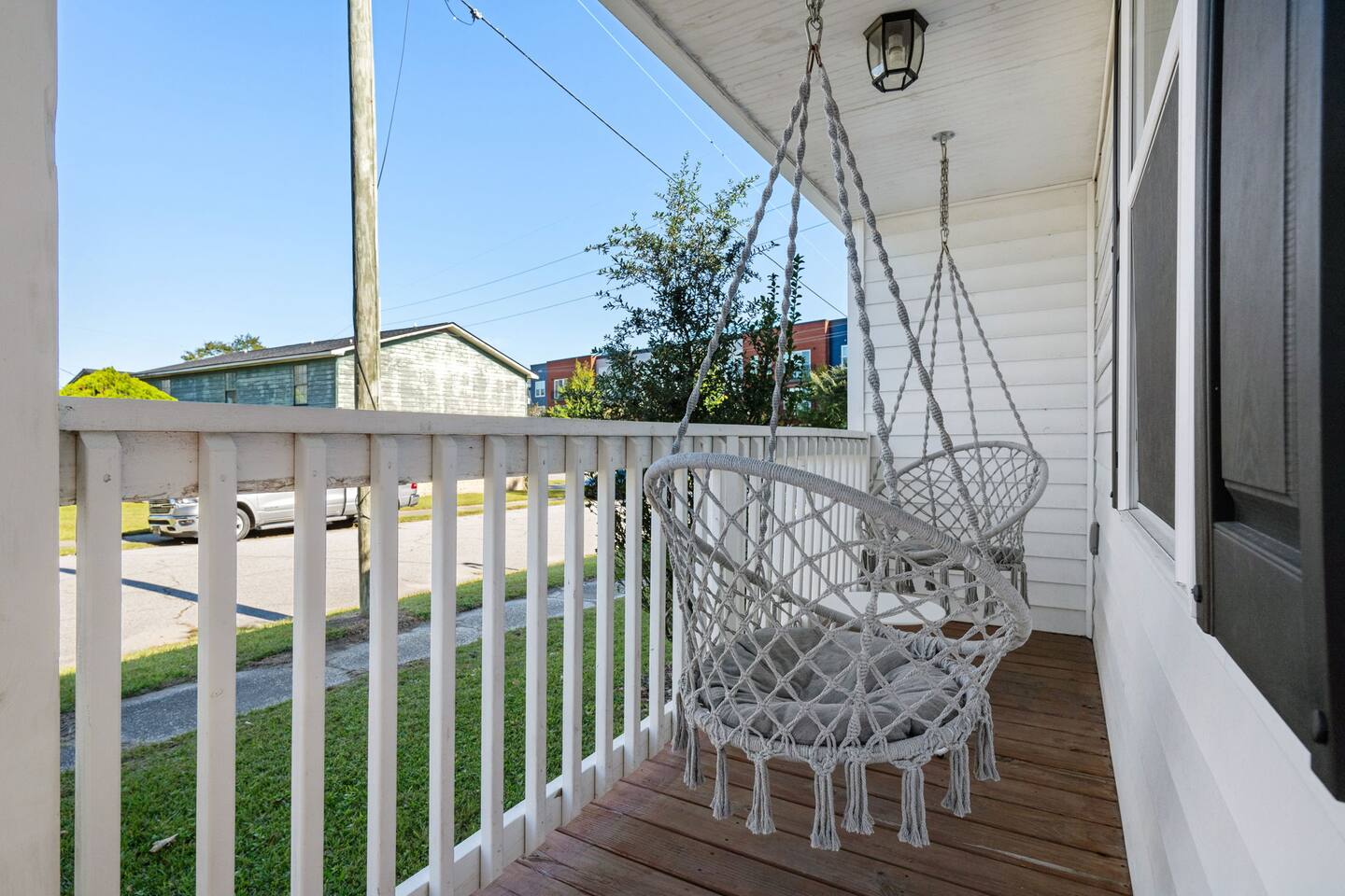 The property features: PORCH SEATING The wrap-around porch features 2 hammock swings. A BRIGHT, OPEN LIVING AREA Once inside, through the private entrance, guests walk into the living room. The living room features a modern sofa and a large flat screen TV. AN EQUIPPED KITCHEN The kitchen, which is open to the living room, comes fully equipped with brand new appliances including an oven, stovetop, standard-sized refrigerator/freezer, microwave, coffee maker, as well as basic cookware. Beneath the beautiful butcherblock countertops are four bar stools. On the wall opposite the kitchen is a laundry station housing full-size washer and dryer units. 2 COMFORTABLE BEDROOMS AND 1 FULL BATHROOM Both bedrooms feature queen-size beds with brand-new mattresses and luxuriously soft linens. The beds are topped with fluffy (hypoallergenic) down-alternative comforters. Both rooms have individually controlled HVAC and ceiling fans to allow you to achieve your ideal sleeping conditions. The rooms also come with dressers and closets to store your things, and one bedroom also has a desk and chair. The full bathroom, located in the hallway between the two bedrooms, boasts beautiful tile flooring, brand new fixtures, and a full bathtub/shower. PRIVATE PARKING With its own private driveway that accommodates up to 2 vehicles, parking and unloading will be the least of your worries throughout your stay here! INCLUDED WITH EACH STAY: Complimentary Free High-Speed Internet/WiFi Complimentary Coffee, Tea, and Sugar Paper Products (toilet paper, paper towels) Hotel Quality Bath Amenities (Public Goods shampoo, conditioner, body wash, and hand soap) Dish/Laundry Detergents Hair Dryer/Iron/Ironing Board Towels/Linens Basic Cooking/Kitchenware