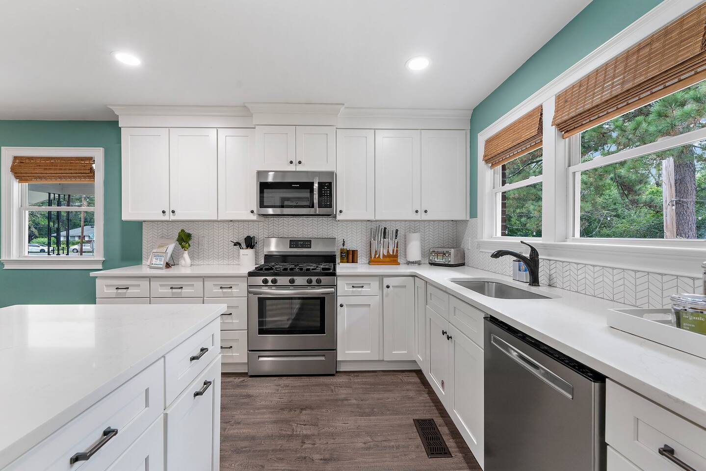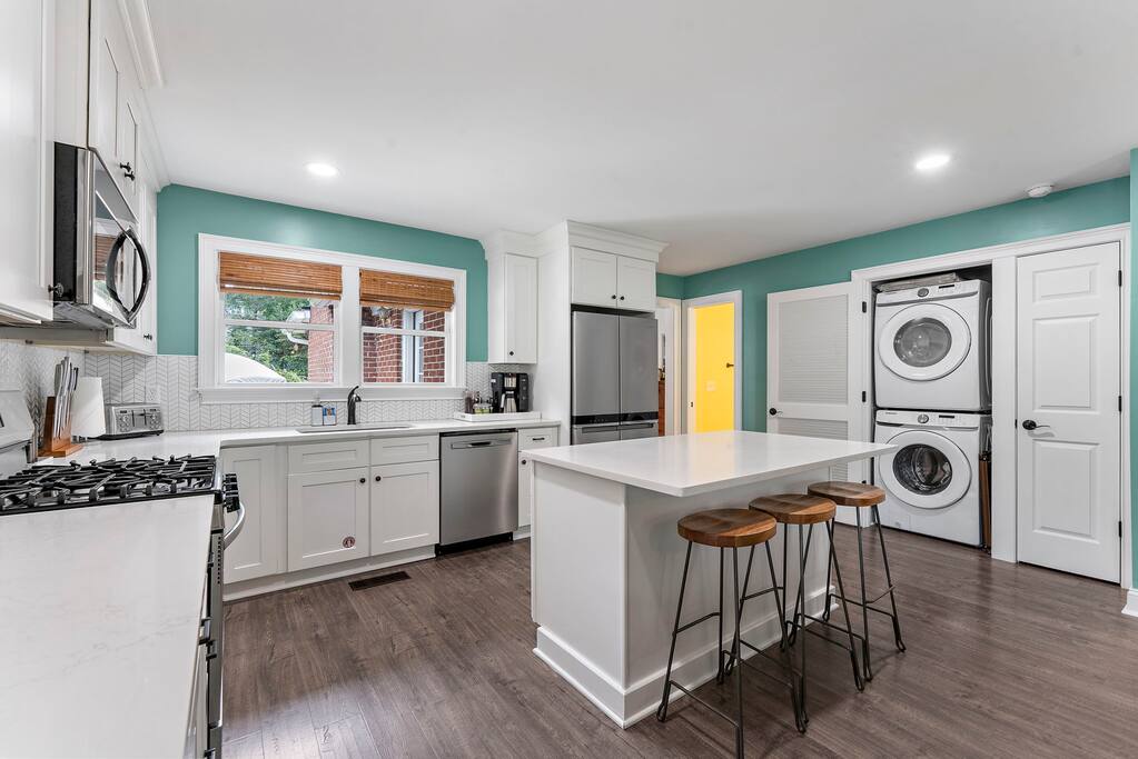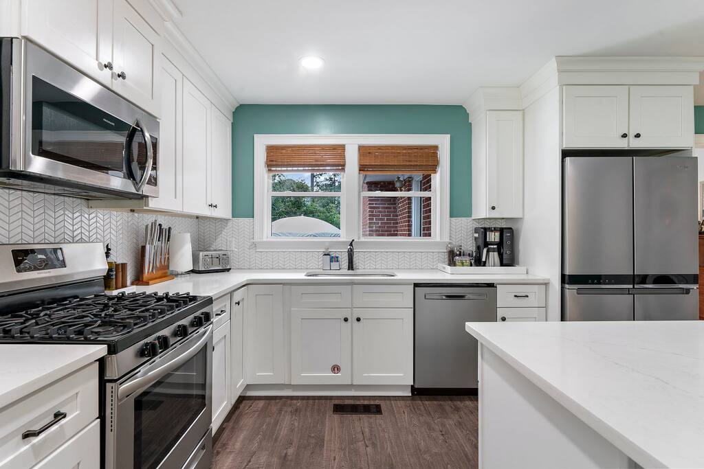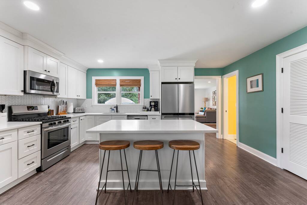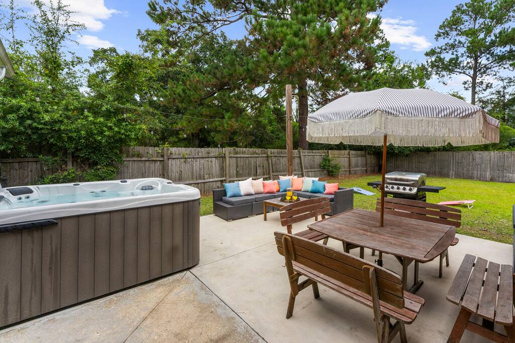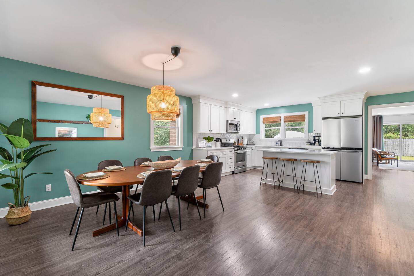 This property features: GOURMET KITCHEN & DINING The bright, open kitchen has brand new high-end appliances, immaculate counter tops, and a central island with stools. The kitchen is equipped with the tools you need to whip up a gourmet meal for your group. The kitchen is open to the dining area, making it an ideal space for a family dinner. The 8 ft dining table with 10 seats was custom-made for our space. LARGE FAMILY ROOM OVERLOOKING THE BACKYARD Past the kitchen you’ll find a spacious comfortable family room designed for entertaining with a large sectional Joybird couch, record player and record collection, board games, and a smart TV. The sectional folds out into a queen bed. PRIVATE FENCED YARD W/ DINING, LOUNGE, & GRILL Sliding glass doors open the family room to the large backyard. It is surrounded by a privacy fence, making it a great place for the kids, pups, or even the adults to play. We provide corn hole, bocce ball, and a frisbee golf set. The concrete patio is furnished with a picnic table (seats 8), a sectional (also seats 8), and a gas grill. There's a train track that runs directly behind our privacy fence. Trains run several times daily and toot their horns. It can be very fun for the kids, but if you are sensitive to loud noises this may not be the property for you. Park Circle is surrounded by trains, so you'll want to consider other parts of the Charleston area. 4 COMFORTABLE BEDROOMS The primary bedroom overlooks the backyard and features a king-sized bed, walk-in closet, and an ensuite bathroom with a huge walk-in shower. The other three bedrooms all have queen beds. All four beds have memory gel mattresses and luxuriously soft all cotton linens. The beds are topped with fluffy (hypoallergenic) down-alternative comforters. Three of the bedrooms have large smart tvs. 3 MODERN BATHROOMS The house contains three large bathrooms - two with huge walk-in showers and one with a bathtub and shower combination - enough space for your whole group to get ready at once. DOG FRIENDLY - NO BREED OR SIZE RESTRICTIONS We love dogs and our home is pet-friendly! We only asked that you please keep them off of the furniture and that you clean up after them. Please shoot us a message before booking if you are interested in bringing your pup so we can let our cleaners know. EASY UNLOADING & CONVENIENT PARKING There is a covered carport, long driveway, and plenty of space for parking. INCLUDED WITH EACH STAY: 100% cotton bed linens and towels High-speed internet/Wi-Fi Whole bean coffee, tea, and sugar Toilet paper and paper towels Hotel quality shampoo, conditioner, hand soap, body wash Dish and laundry detergents Hair dryer Iron and ironing board Cooking supplies and kitchenware Board games and books Records and record player
