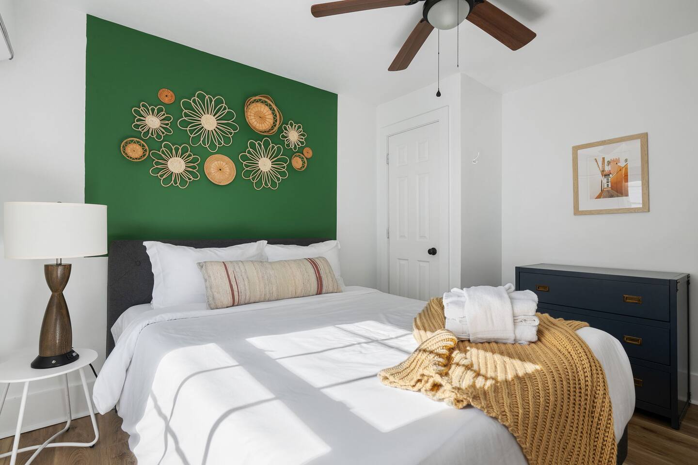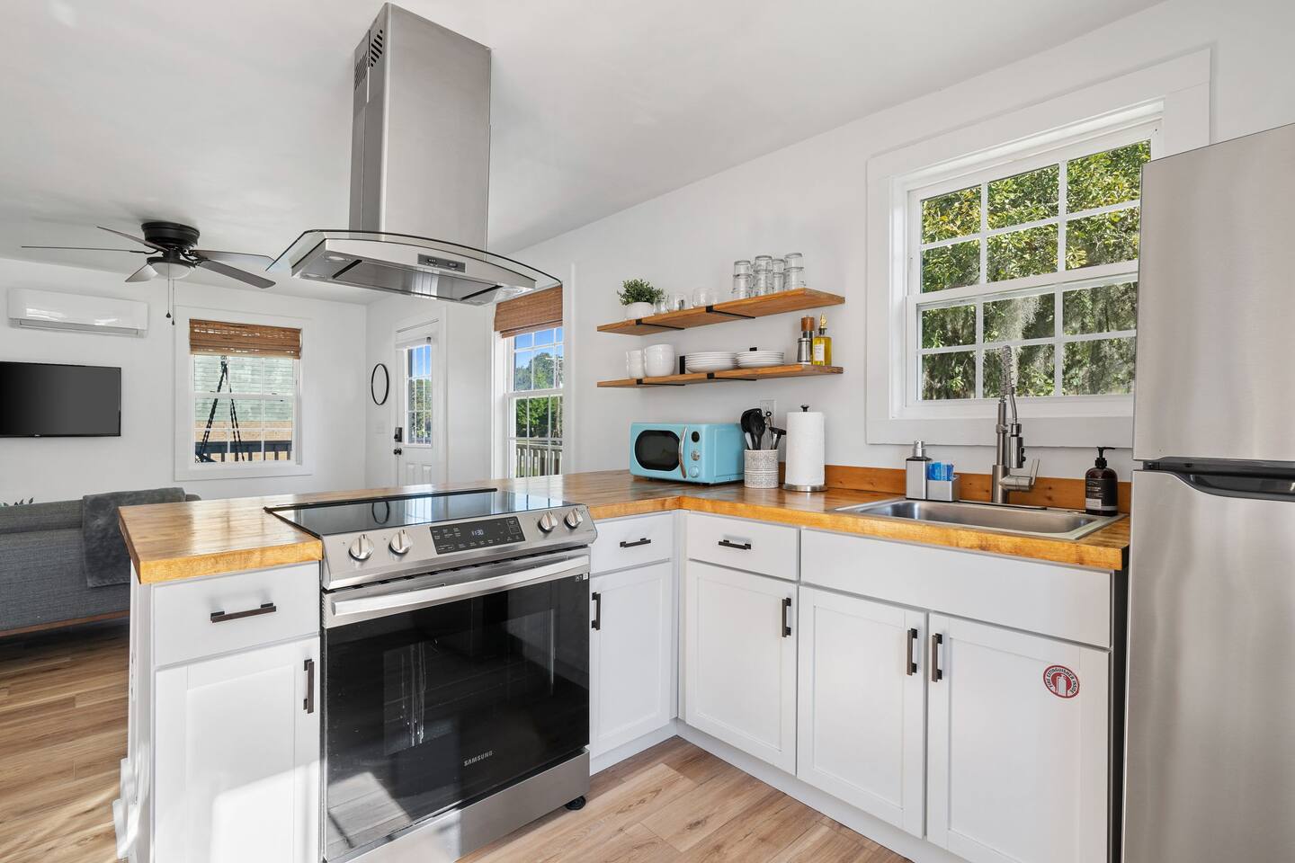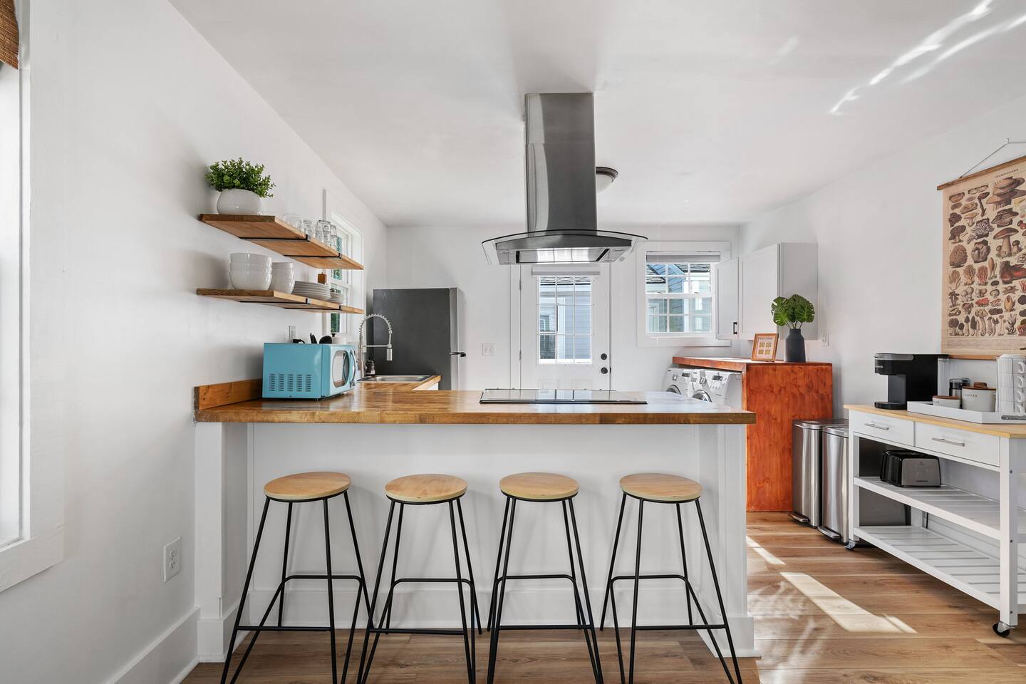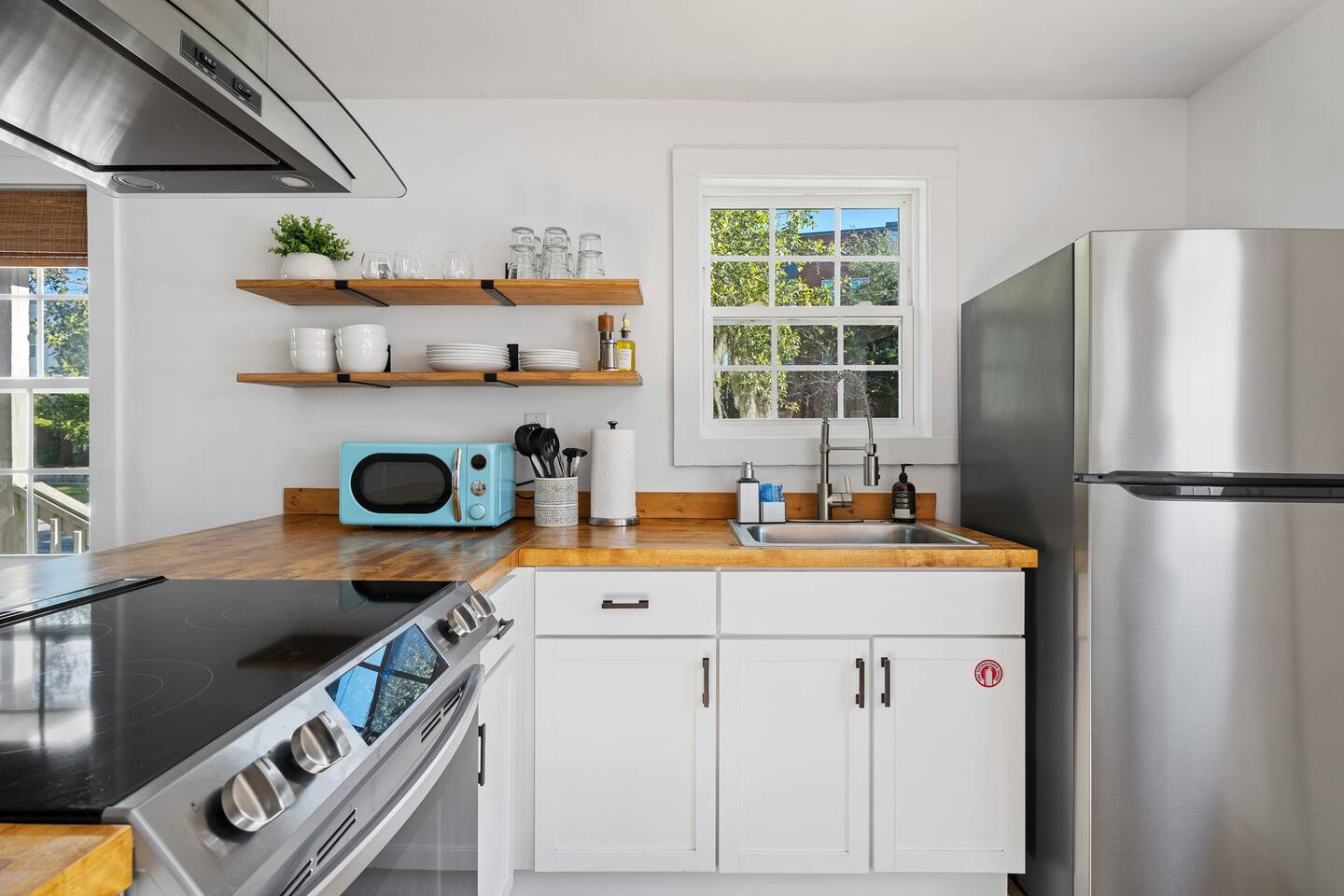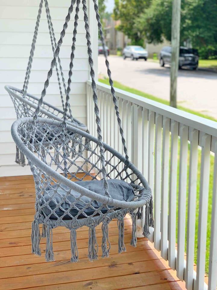 The property features: PORCH SEATING The wrap-around porch features 2 hammock swings. A BRIGHT, OPEN LIVING AREA Once inside, through the private entrance, guests walk into the living room. The living room features a modern sofa and a large flat screen TV. AN EQUIPPED KITCHEN The kitchen, which is open to the living room, comes fully equipped with brand new appliances including an oven, stovetop, standard-sized refrigerator/freezer, microwave, coffee maker, as well as basic cookware. Beneath the beautiful butcherblock countertops are four bar stools. On the wall opposite the kitchen is a laundry station housing full-size washer and dryer units. 2 COMFORTABLE BEDROOMS AND 1 FULL BATHROOM Both bedrooms feature queen-size beds with brand-new mattresses and luxuriously soft linens. The beds are topped with fluffy (hypoallergenic) down-alternative comforters. Both rooms have individually controlled HVAC and ceiling fans to allow you to achieve your ideal sleeping conditions. The rooms also come with dressers and closets to store your things, and one bedroom also has a desk and chair. The full bathroom, located in the hallway between the two bedrooms, boasts beautiful tile flooring, brand new fixtures, and a full bathtub/shower. PRIVATE PARKING With its own private driveway that accommodates up to 2 vehicles, parking and unloading will be the least of your worries throughout your stay here! INCLUDED WITH EACH STAY: Complimentary Free High-Speed Internet/WiFi Complimentary Coffee, Tea, and Sugar Paper Products (toilet paper, paper towels) Hotel Quality Bath Amenities (Public Goods shampoo, conditioner, body wash, and hand soap) Dish/Laundry Detergents Hair Dryer/Iron/Ironing Board Towels/Linens Basic Cooking/Kitchenware